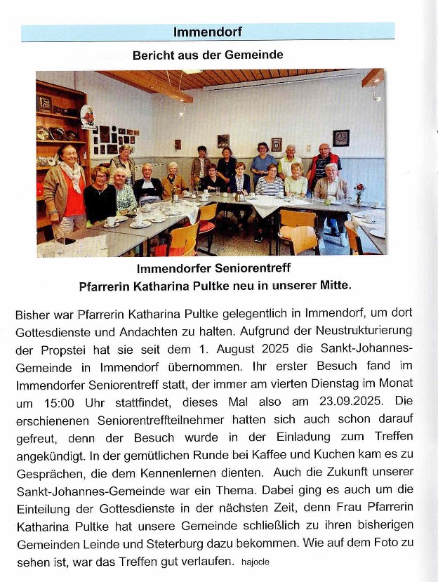 Die LichterkircheAm 25.11.2022 um 17.00 Uhr fand in der Sankt Johannes Kirche eine Andacht im Kerzenschein statt. Im Anschluss war ein gemütliches Beisammensein bei dem es unter andrem Schmalsbrotscheiben sowie heiße Würstchen, Glühwein und Kinderpunsch gab. Auch ist der neue Immendorfkalender 2023 dort verkauft worden. Viele Anwesende haben sich so auf den Advent gefreut!Der Weihnachtsmarkt in ImmendorfAm 26.11.2022 ab15.00Uhr fand der vorweihnachtliche Markt nach Jahren wieder auf unserem Kirchhof statt. Hier wurden viele Dinge zum Kauf angeboten wie zum Beispiel, Advents- und Weihnachtsdeko sowie einige Leckereien. Natürlich haben auch die vielen Ständen für das leibliche Wohl gesorgt! Als Highlight hat unser Pastor jedem der es möchte die Schuhe geputzt. Die Kirchengemeinde, die Freiwillige Feuerwehr, der MTV Immendorf sowie die Parteien konnten sich an Ihren Ständen an den recht viele Besuchern erfreuen!Seniorinnen & Senioren WeihnachtsfeierZur Einladung zur Weihnachtsfeier der Seniorinnen & Senioren, haben sich recht viele Besucher eingefunden. Endlich wieder eine Weihnachtsfeier! Am Dienstag, den 13.12.2022 hatte der Kirchenvorstand recht herzlich einladen. Es begann um 15.00 Uhr mit einer kleinen Andacht in der Schule. Mit Kaffee und Kuchen sowie einigen kleinen Überraschungen hatten die Seniorinnen und Senioren und der Kirchenvorstand einen wunderschönen gemütlichen Nachmittag! Für die musikalische Untermalung sorgte Erwin Kasten mit seiner DrehorgelEinen herzlichen Dank an die Organisatoren!