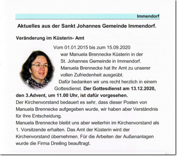 Unter dem Motto Schritte gehen, stand der Festgottesdienst in der Sankt Johannes Kirche in Immendorf.Das einjährige Bestehen des Pfarrverband Salzgitters Norden wurde am Sonntag, den 12. Januar mit einem feierlichen Gottesdienst gewürdigt. Vele Teilnehmer aus dem Pfarrverband sind zu diesem feierlichen Gottesdienst in die Sankt Johannes Kirche erschienen. Gemeinsam Schritte wagen, empfahl Gemeindepfarrer der Gemeinden Thiede und Immendorf Jens Möhle den Anwesenden für die Zukunft, dem vor einem Jahr neu gegründeten Pfarrverband Salzgitters Norden. So kann der Zusammenschluss in eine gute und erfolgreiche Zukunft gehen und gemeinsam die Ziele und Probleme angegangen bewältigt werden. Steterburgs Pfarrerin Katharina Pultke führte die Anwesenden in Ihrer Predigt, auf eine gute Zusammenarbeit der Gemeinden des Pfarrverband Salzgitters Norden mit dem Hinweis auf die Taufe von Jesus Christus durch ein einfaches Gemeindemitglied zu der Zeit hin! So sollte die gemeinsame Arbeit im Pfarrverband Salzgitters Norden in Zukunft auch gemeinsam im christlichen Sinne bewältigt werden. Die Vorsitzende des Pfarrverband Salzgitters Norden, Frau Doris Günter, wünschte zum Abschluss den Erschienenen Kirchenvorstandsmitgliedern und Helfern in den Gemeinden des Pfarrverbands eine gute Hand und gutes Gelingen ihrer ehrenamtlichen Tätigkeit. Im Anschluss an den Gottesdienst hatte der Immendorfer Kirchenvorstand zum besserem Kennenlernen der Anwesende einen kleinen Kaffee und Kuchen Imbiss bereitgestellt. Hajocle