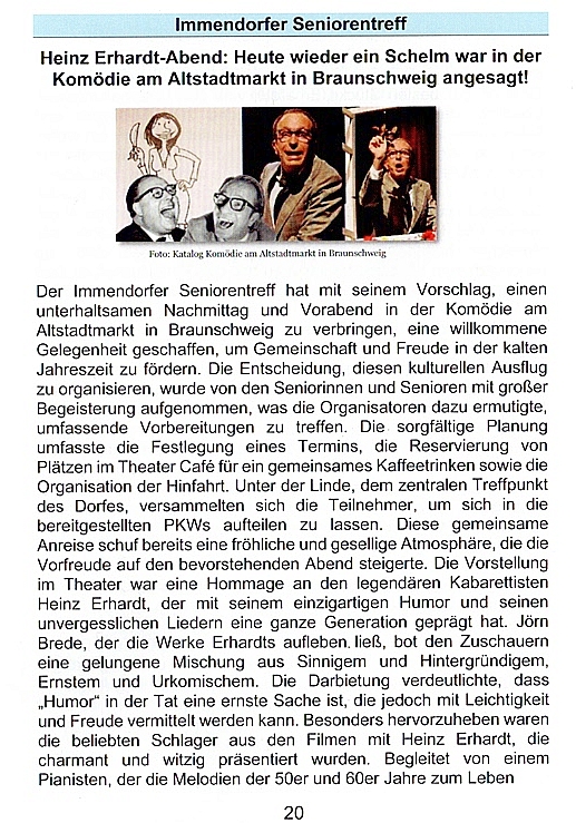 Immendorfer SeniorentreffDie Fotoshow „Erinnerungen“Am 23.05.2017 fand in der alten Schule (Feuerwehrhaus) die Foto-Videoshow „Erinnerungen“ statt.Die Show wurde unter Mitwirkung der Seniorinnen und Senioren erstellt. Es wurde in alten Fotoalben und Aufbewahrungskisten gestöbert. Dabei kamen viele alte, fast vergessene Fotos zum Vorschein. Aber auch Fotos von Immendorfer Veranstaltungen bis in die Gegenwart waren zu sehen. Zu Familien oder einzelnen Personen gebündelt, wurden die Foto-Raritäten dann in der Ausstellung gezeigt. Die Vorführung sorgte bei den Zuschauern für heitere, aber auch bewegte Stimmung und angeregte Unterhaltung. Die Bilder reichten von der Jugendzeit über die goldene Hochzeit, die Kriegs- und Nachkriegszeit, die Flucht aus der Heimat, den Neuanfang in Salzgitter bis in die heutige Zeit. „Erinnerungen“ war das Thema. Fazit: Die Show hat ihr Ziel erreicht und den Zuschauern geholfen, in Erinnerungen zu schwelgen und somit allen einen schönen Nachmittag bereitet.hajocle