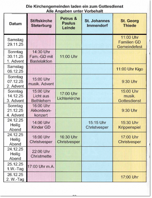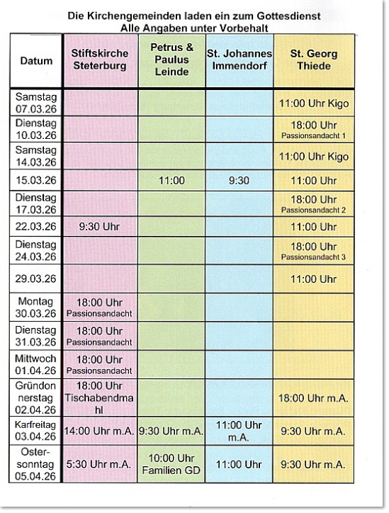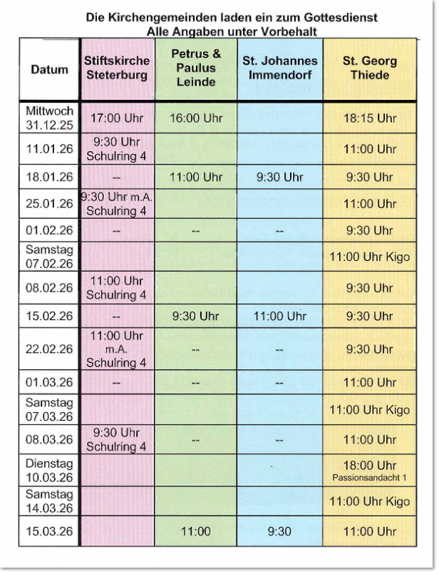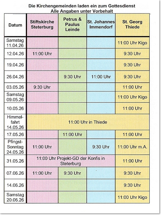 Der Immendorfer Kirchenvorstand und unsere Pfarrerin Katharina Pultke geben bekannt, dass die Gottesdienste in Immendorf und den anderen Gemeinden den folgenden Tabellen zu entnehmen sind. Da alle Gemeinden im Umkreis liegen und leicht zu erreichen sind, laden wir Sie herzlich ein, wenn in Ihrem Ort zu der Zeit kein Termin ist, auch einmal einen Gottesdienst in einer anderen Gemeinde zu besuchen.