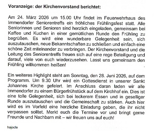 Gottesdienste in der Immendorfer Johannes Kiche