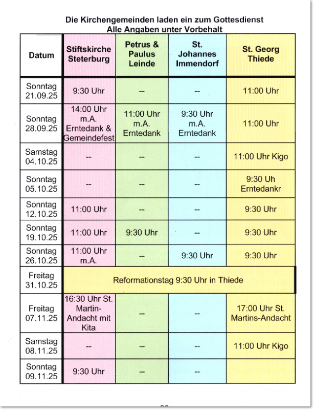Unsere Kirchen der Gemeinden Immendorf und Thiede liegen nur wenige Kilometer von einander entfernt und auch die St. Georg Kirche in Thiede ist in kurzer Zeit zu erreichen. Suchen Sie sich doch einfach die Gottesdiensttermine aus, die Ihnen zusagen und gehen Sie ruhig einmal in einen Gottesdienst der Nachbargemeinde.Sie sind überall herzlich Willkommen!___________________________________________Kinderkirche findet zur Zeit in Thiede statt._________________________________