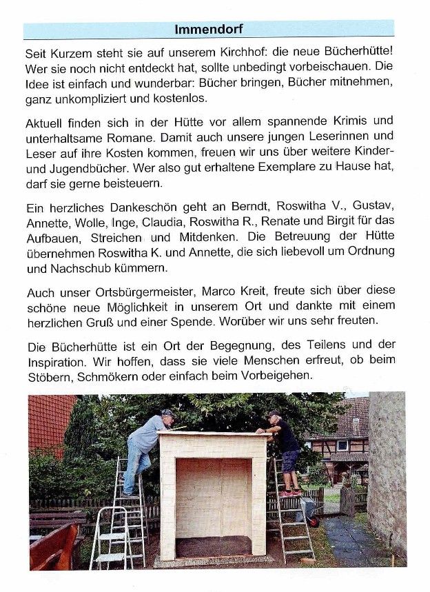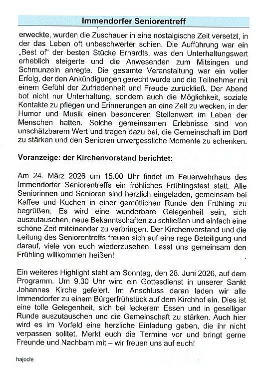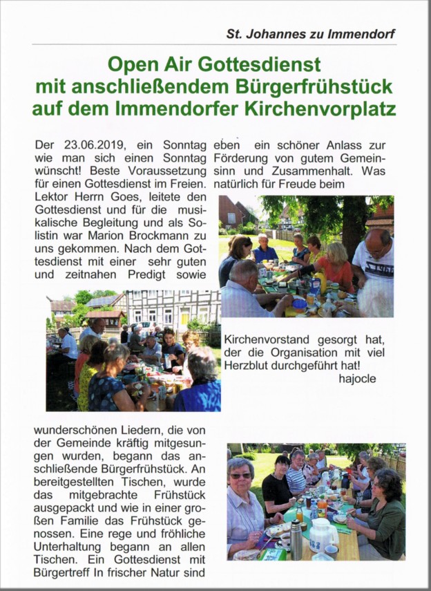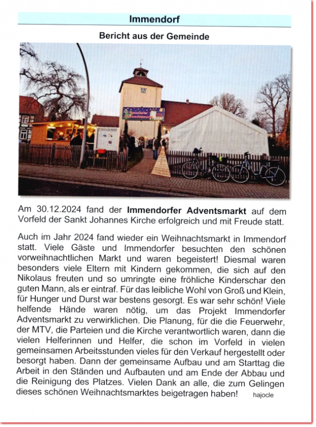 Die LichterkircheAm 25.11.2022 um 17.00 Uhr fand in der Sankt Johannes Kirche eine Andacht im Kerzenschein statt. Im Anschluss war ein gemütliches Beisammensein bei dem es unter andrem Schmalsbrotscheiben sowie heiße Würstchen, Glühwein und Kinderpunsch gab. Auch ist der neue Immendorfkalender 2023 dort verkauft worden. Viele Anwesende haben sich so auf den Advent gefreut!Der Weihnachtsmarkt in ImmendorfAm 26.11.2022 ab15.00Uhr fand der vorweihnachtliche Markt nach Jahren wieder auf unserem Kirchhof statt. Hier wurden viele Dinge zum Kauf angeboten wie zum Beispiel, Advents- und Weihnachtsdeko sowie einige Leckereien. Natürlich haben auch die vielen Ständen für das leibliche Wohl gesorgt! Als Highlight hat unser Pastor jedem der es möchte die Schuhe geputzt. Die Kirchengemeinde, die Freiwillige Feuerwehr, der MTV Immendorf sowie die Parteien konnten sich an Ihren Ständen an den recht viele Besuchern erfreuen!Seniorinnen & Senioren WeihnachtsfeierZur Einladung zur Weihnachtsfeier der Seniorinnen & Senioren, haben sich recht viele Besucher eingefunden. Endlich wieder eine Weihnachtsfeier! Am Dienstag, den 13.12.2022 hatte der Kirchenvorstand recht herzlich einladen. Es begann um 15.00 Uhr mit einer kleinen Andacht in der Schule. Mit Kaffee und Kuchen sowie einigen kleinen Überraschungen hatten die Seniorinnen und Senioren und der Kirchenvorstand einen wunderschönen gemütlichen Nachmittag! Für die musikalische Untermalung sorgte Erwin Kasten mit seiner DrehorgelEinen herzlichen Dank an die Organisatoren!