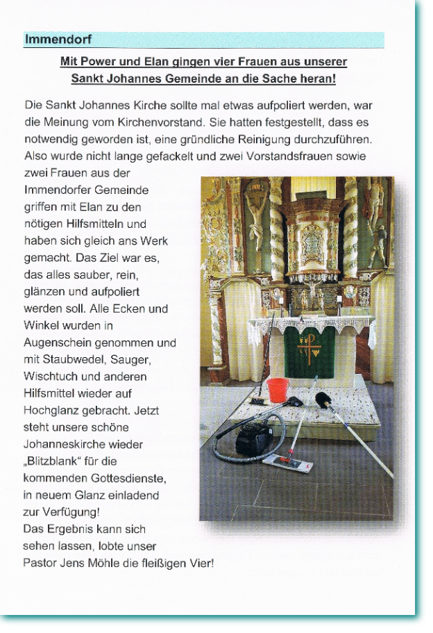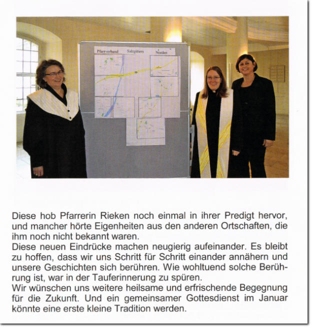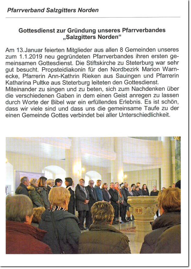 Unter dem Motto Schritte gehen, stand der Festgottesdienst in der Sankt Johannes Kirche in Immendorf.Das einjährige Bestehen des Pfarrverband Salzgitters Norden wurde am Sonntag, den 12. Januar mit einem feierlichen Gottesdienst gewürdigt. Vele Teilnehmer aus dem Pfarrverband sind zu diesem feierlichen Gottesdienst in die Sankt Johannes Kirche erschienen. Gemeinsam Schritte wagen, empfahl Gemeindepfarrer der Gemeinden Thiede und Immendorf Jens Möhle den Anwesenden für die Zukunft, dem vor einem Jahr neu gegründeten Pfarrverband Salzgitters Norden. So kann der Zusammenschluss in eine gute und erfolgreiche Zukunft gehen und gemeinsam die Ziele und Probleme angegangen bewältigt werden. Steterburgs Pfarrerin Katharina Pultke führte die Anwesenden in Ihrer Predigt, auf eine gute Zusammenarbeit der Gemeinden des Pfarrverband Salzgitters Norden mit dem Hinweis auf die Taufe von Jesus Christus durch ein einfaches Gemeindemitglied zu der Zeit hin! So sollte die gemeinsame Arbeit im Pfarrverband Salzgitters Norden in Zukunft auch gemeinsam im christlichen Sinne bewältigt werden. Die Vorsitzende des Pfarrverband Salzgitters Norden, Frau Doris Günter, wünschte zum Abschluss den Erschienenen Kirchenvorstandsmitgliedern und Helfern in den Gemeinden des Pfarrverbands eine gute Hand und gutes Gelingen ihrer ehrenamtlichen Tätigkeit. Im Anschluss an den Gottesdienst hatte der Immendorfer Kirchenvorstand zum besserem Kennenlernen der Anwesende einen kleinen Kaffee und Kuchen Imbiss bereitgestellt. Hajocle