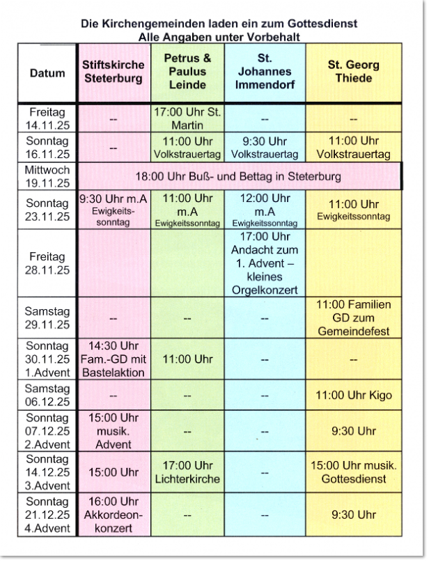 Der Immendorfer Kirchenvorstand und unsere Pfarrerin Katharina Pultke geben bekannt, dass die Gottesdienste in Immendorf und den anderen Gemeinden den folgenden Tabellen zu entnehmen sind. Da alle Gemeinden im Umkreis liegen und leicht zu erreichen sind, laden wir Sie herzlich ein, wenn in Ihrem Ort zu der Zeit kein Termin ist, auch einmal einen Gottesdienst in einer anderen Gemeinde zu besuchen.